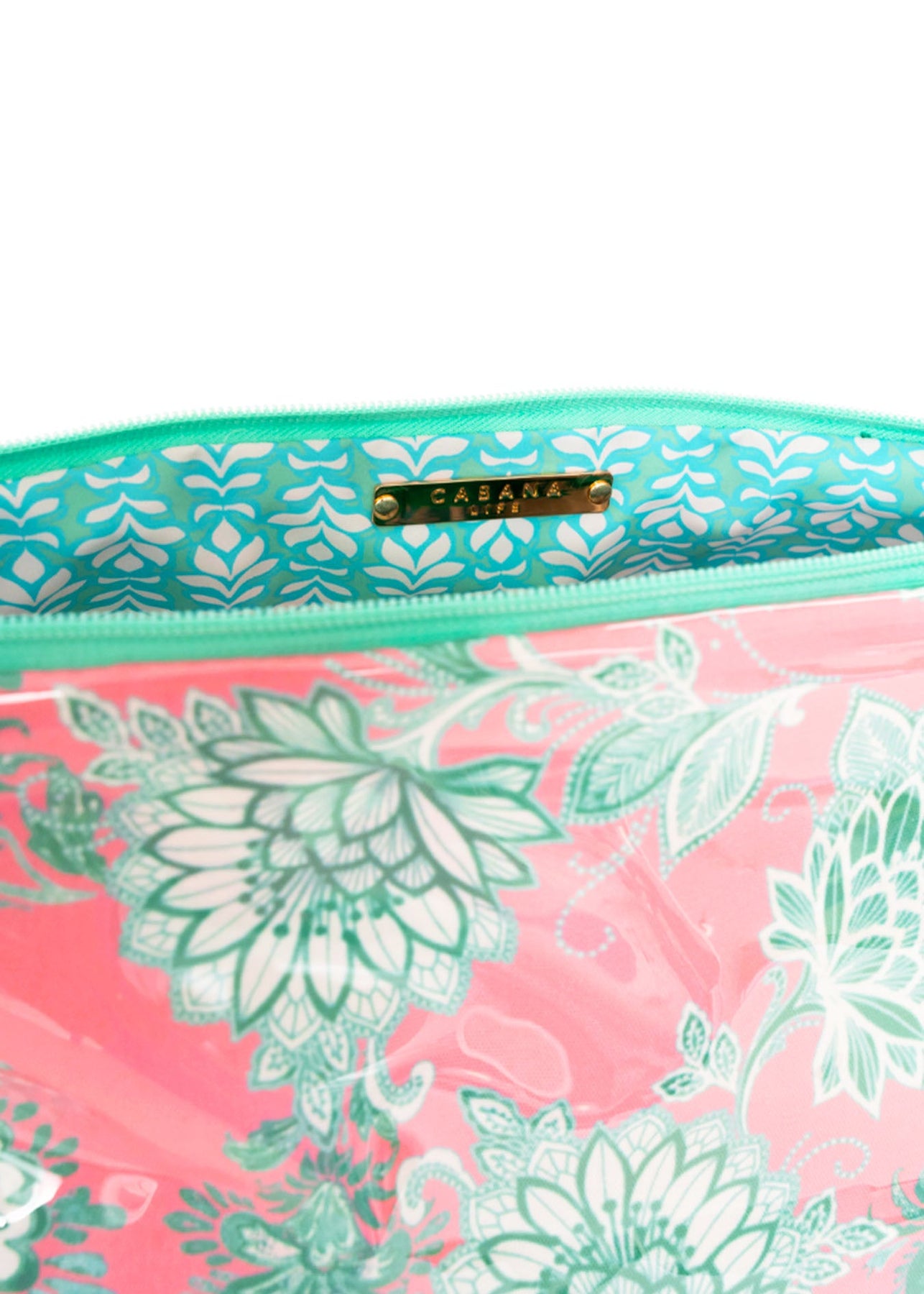 Pack for your next vacation with the Cote d'Azur Large Makeup Bag. The pink floral toiletry case features a mint zip-top closure with printed accent pull, handle and two inside pockets. A roomy bag perfect for a day at the pool or gifting to a friend!